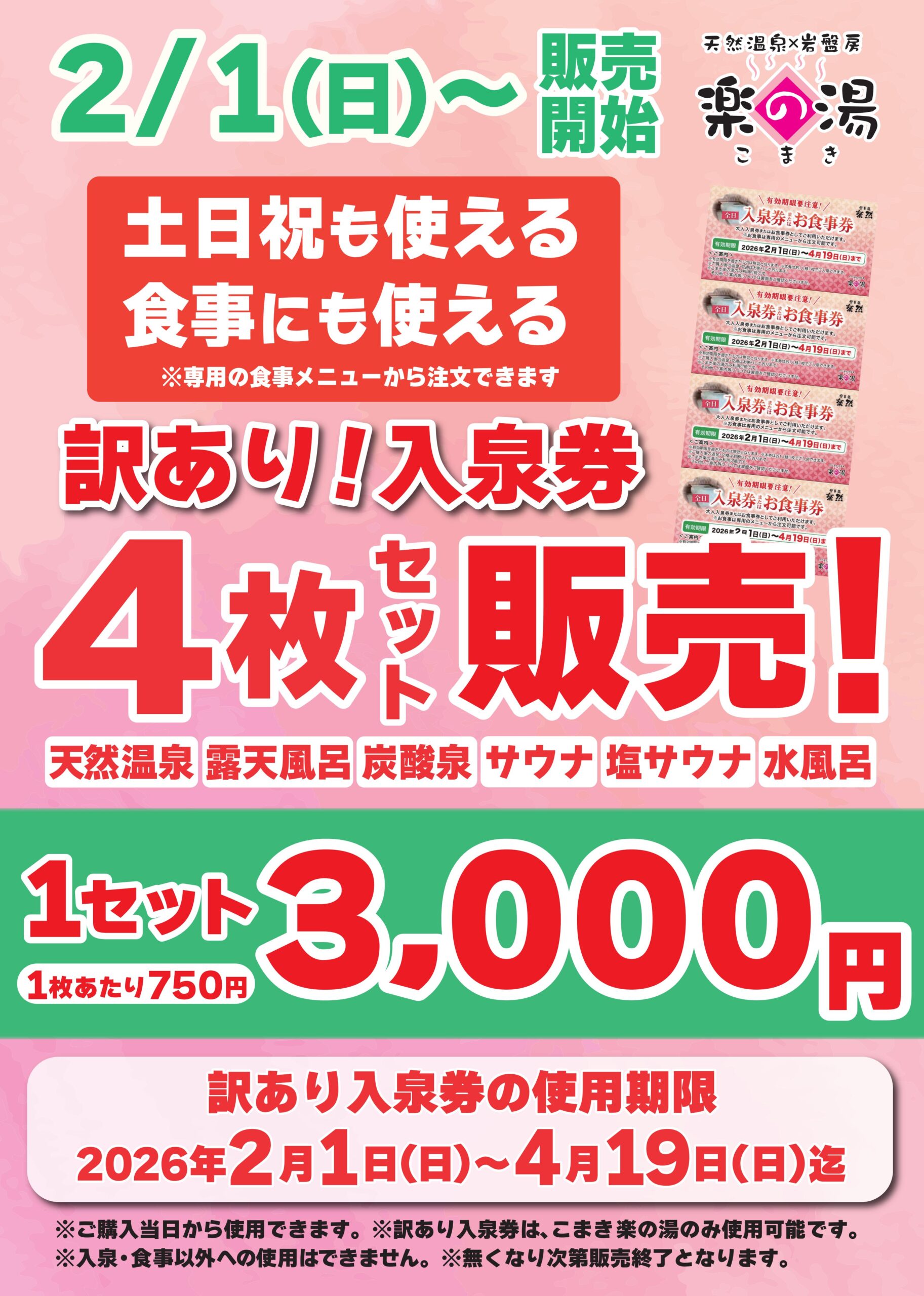 > 2/1 (日)~訳あり入泉券4枚セット販売