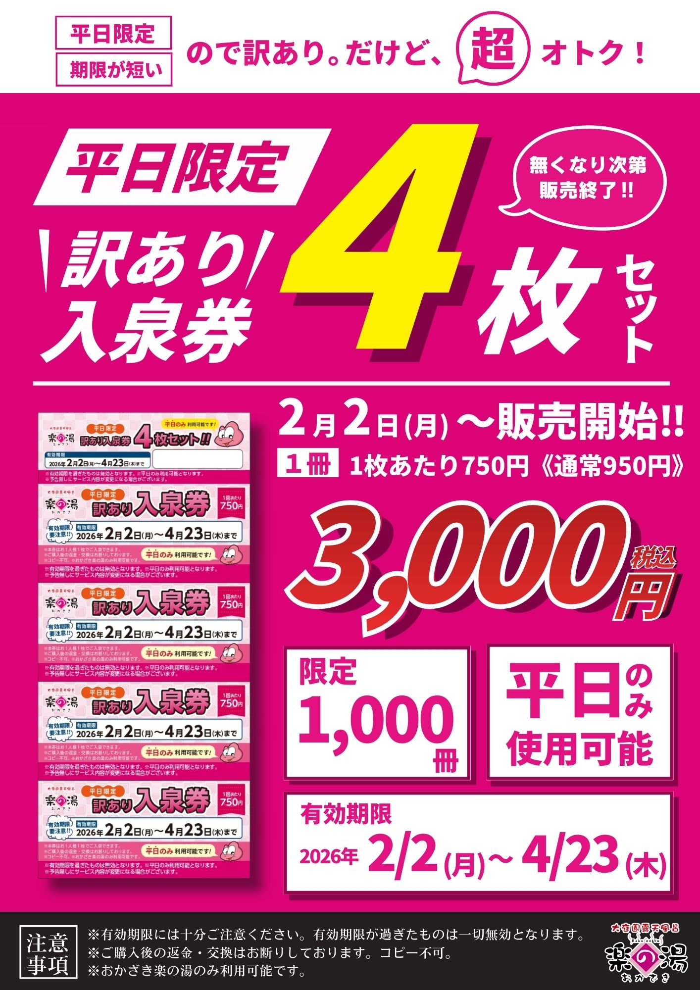 2/2~ 平日限定 訳あり入泉券4枚セット